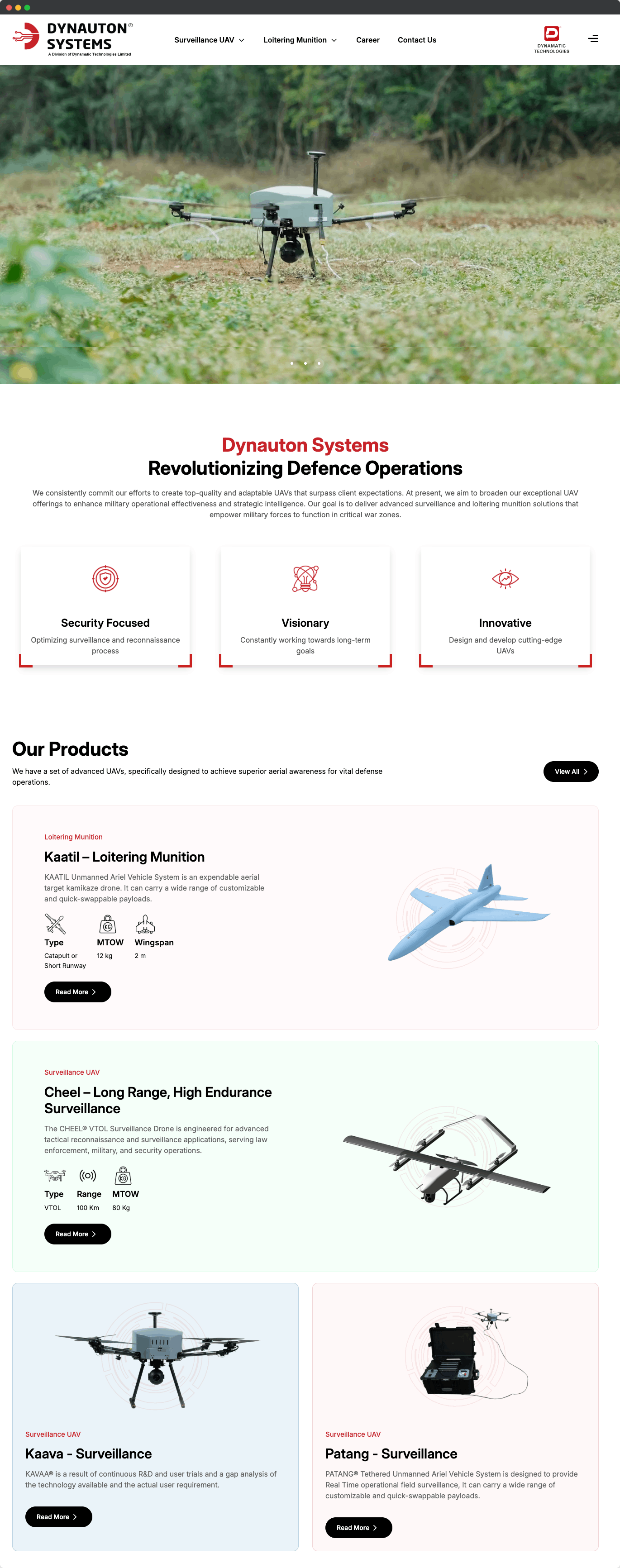 Dynauton’s product website has strengthened its defense and security presence, providing an impactful stage to highlight UAVs like Cheel, Kaava, Patang, and Kaatil. With optimized performance and structured storytelling, the website ensures visitors can easily explore products and understand their advanced capabilities.